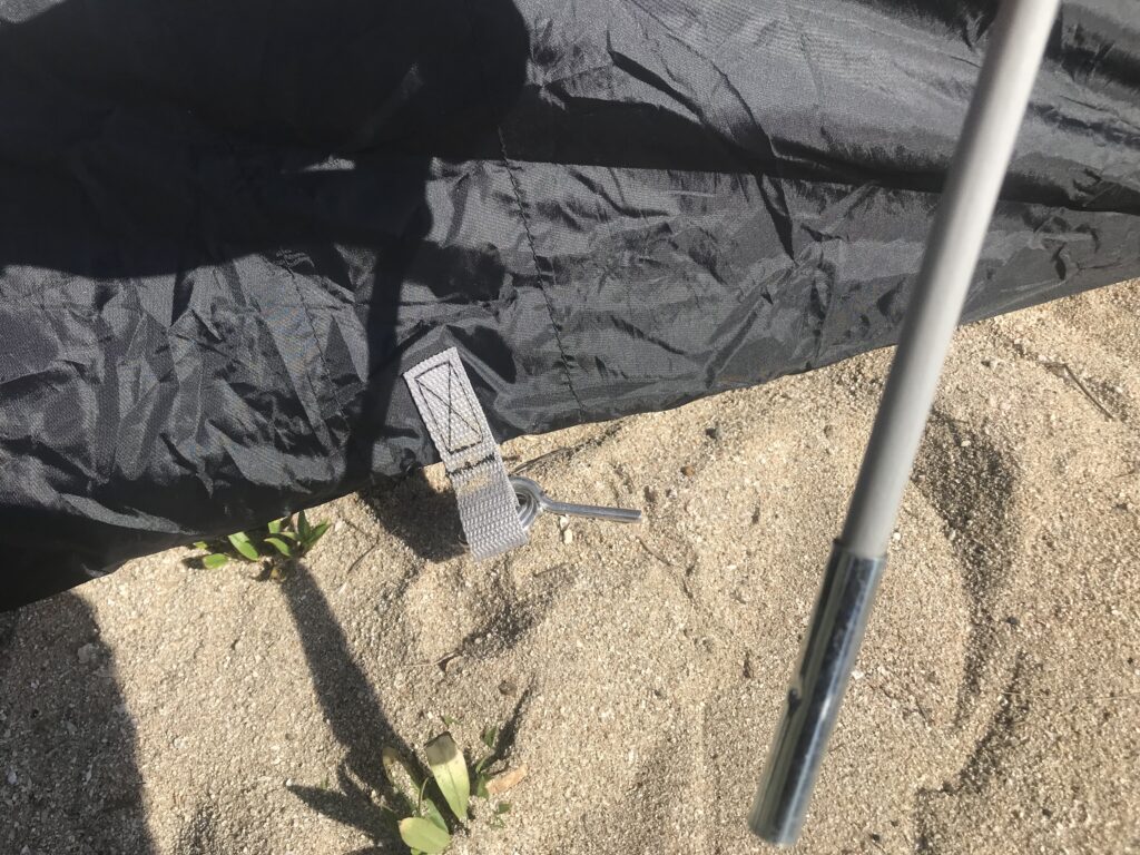 ☑️ フライシートを被せ、マジックテープを各ポールに巻き付けて固定。フックをインナーのD字リングに掛ける。