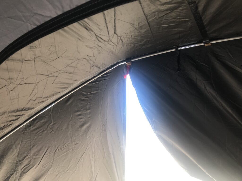 ☑️ ポールを起こし、上側のポールにインナー頂点部のフックを掛ける。