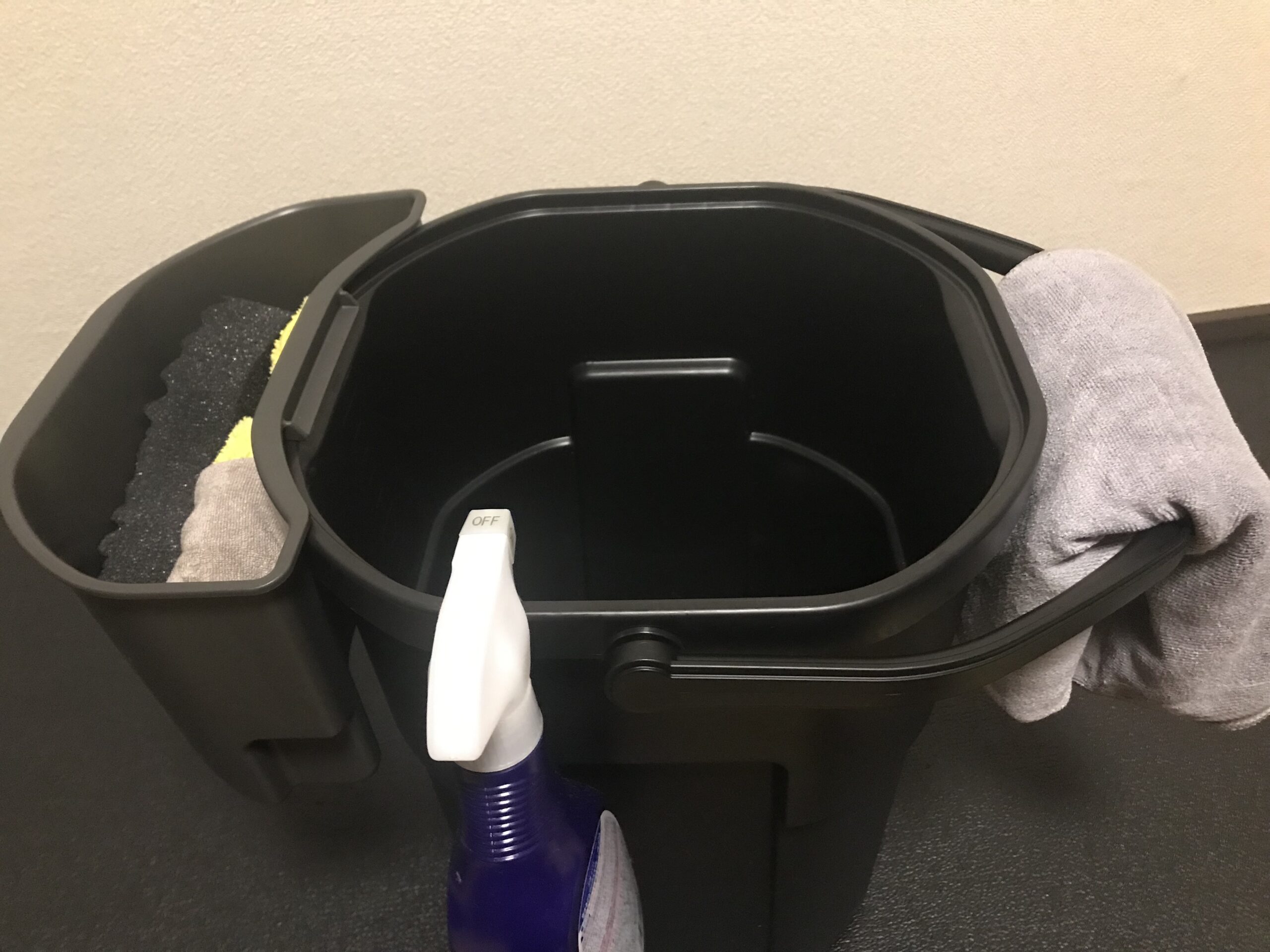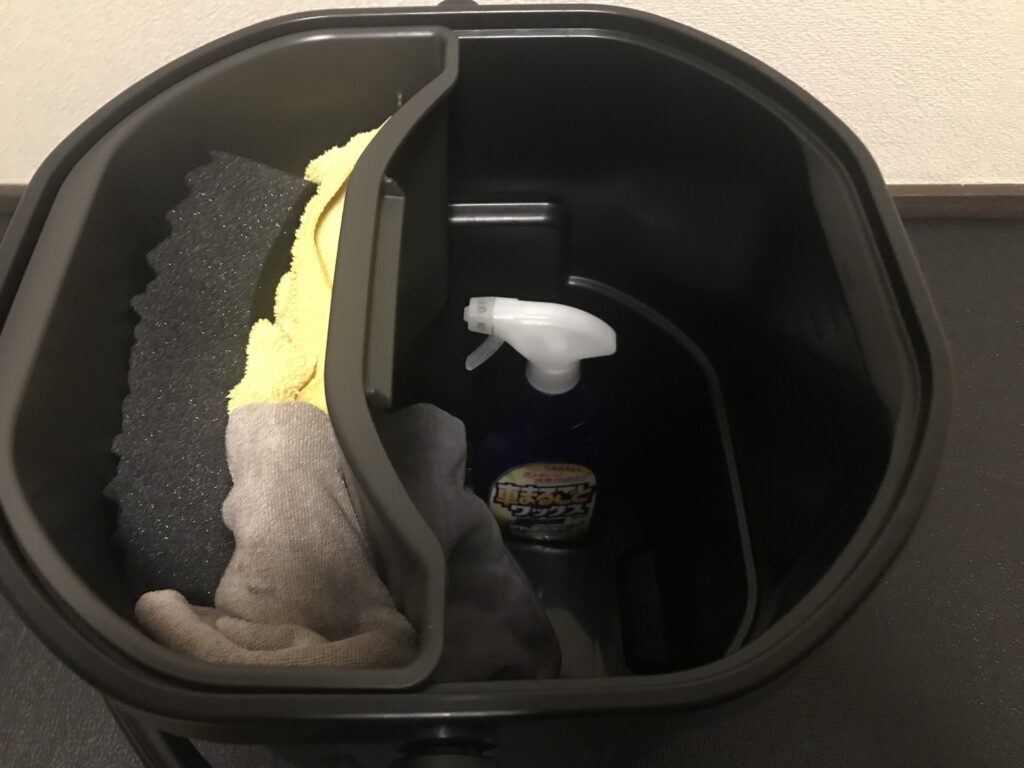 水入れとしてはもちろん、中容器にスポンジやタオル類を入れておけるので、洗車がしやすいのなんの。引っ掛ける部分があるシャンプー類なら、バケットカーゴの縁にも掛けられます。
